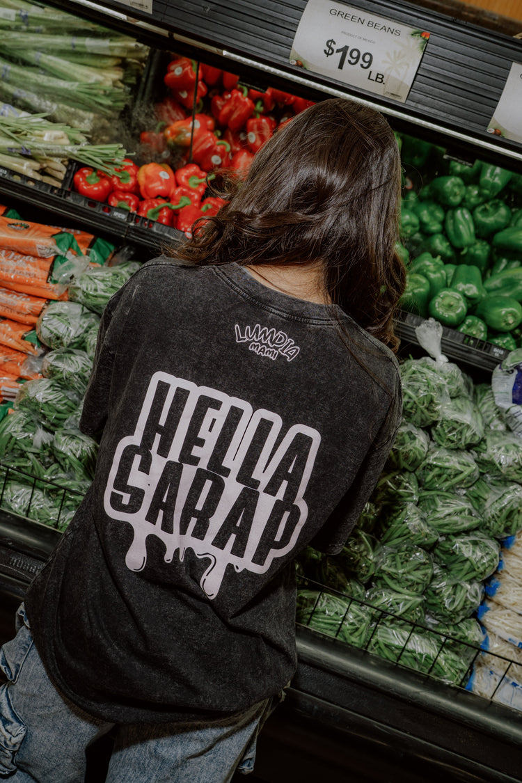@lumpia__mami 's infamous "HELLA SARAP" tee from her viral "Folded (Lumpia Remix)" video on Instagram. If you can't stop by and support her Filipino food stand in person, cop her latest merch so she can continue to pursue her dreams!