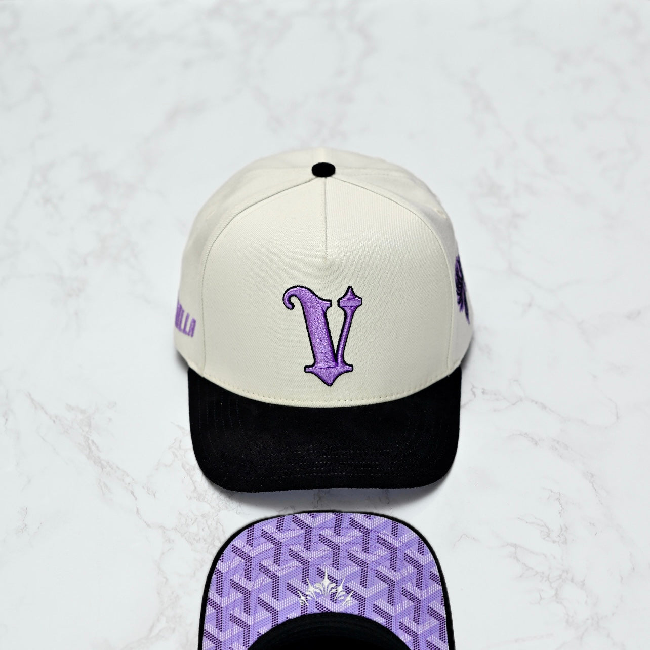 **Every hat constructed with premium fabrics, an extra absorbent sweatband, and a fully satin lined interior for hair health. Our BAYSICS collection hats feature an Off-White Acrylic Wool/Obsidian Suede limited edition sparkle print UV in tones to match the associated team.