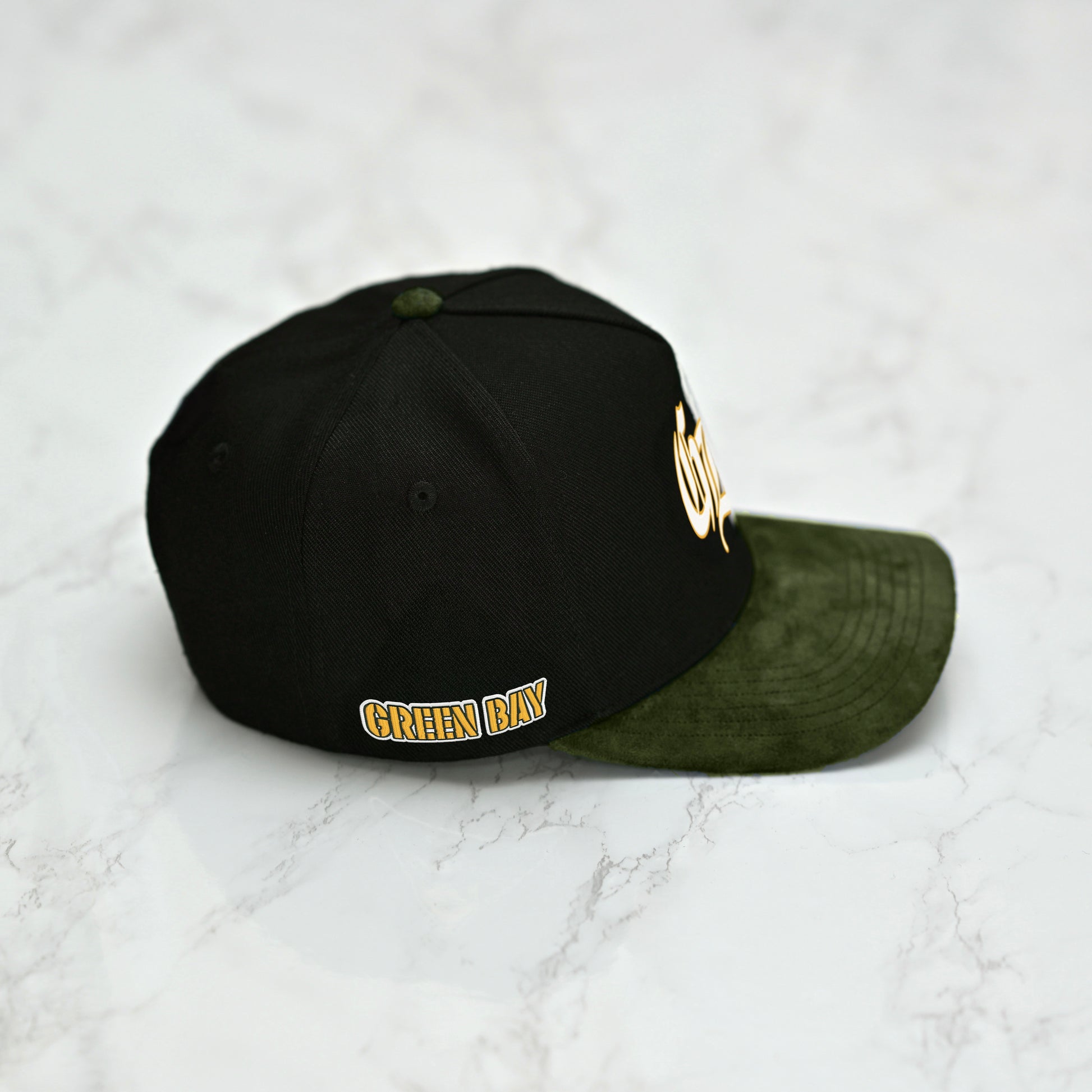Underbrim Embroidery: "GREEN BAY” font inspired by the modern word logo.